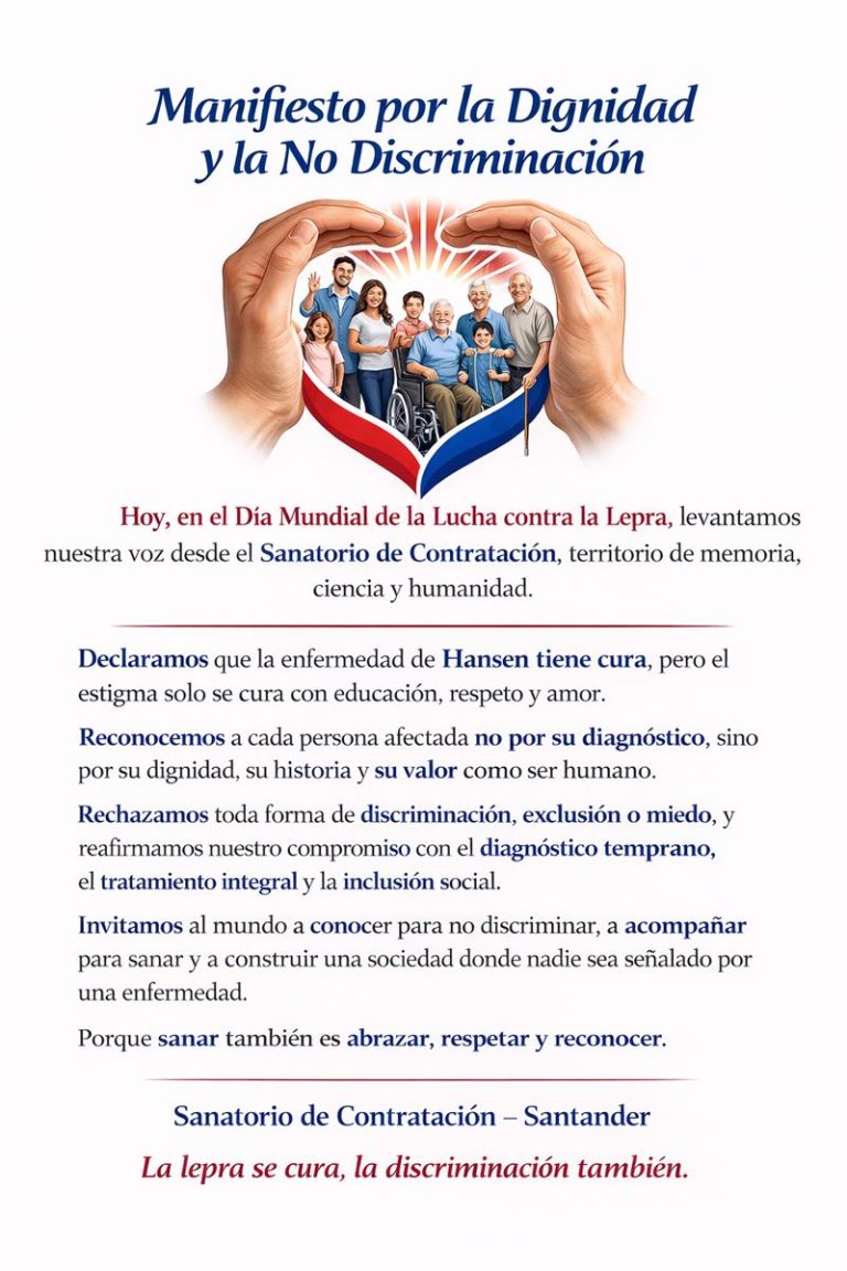 Cada 30 de enero, el mundo conmemora el Día Mundial de la Lucha contra la Lepra, una fecha para reflexionar, educar y reafirmar el compromiso con la dignidad humana. Desde el Sanatorio de Contratación E.S.E., territorio de memoria, ciencia y humanidad, alzamos nuestra voz para recordar que la enfermedad de Hansen tiene cura, pero que el estigma solo se erradica con conocimiento, respeto y amor.